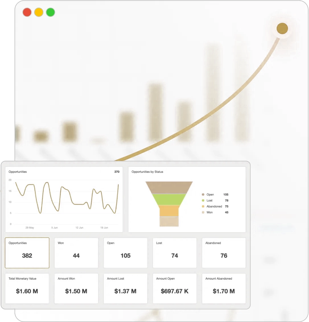 • Analytics & Reports in One Place Get a clear view of your leads, track revenue, and measure performance with a dashboard that keeps all your key metrics organized.