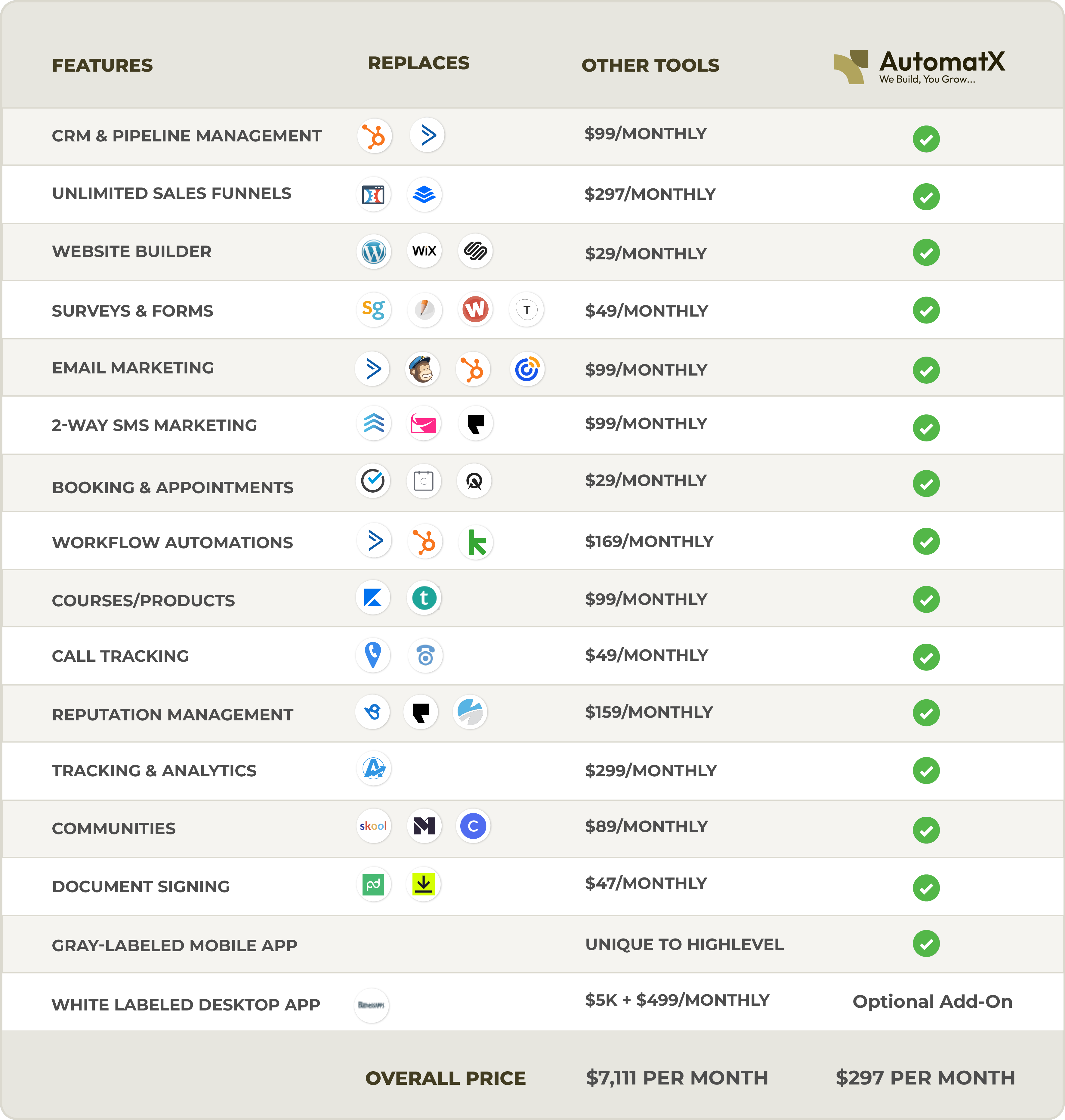 • Everything You Need in One Platform AutomatX brings together all the tools needed to manage leads, websites, funnels, calendars, and more, keeping everything in one place.